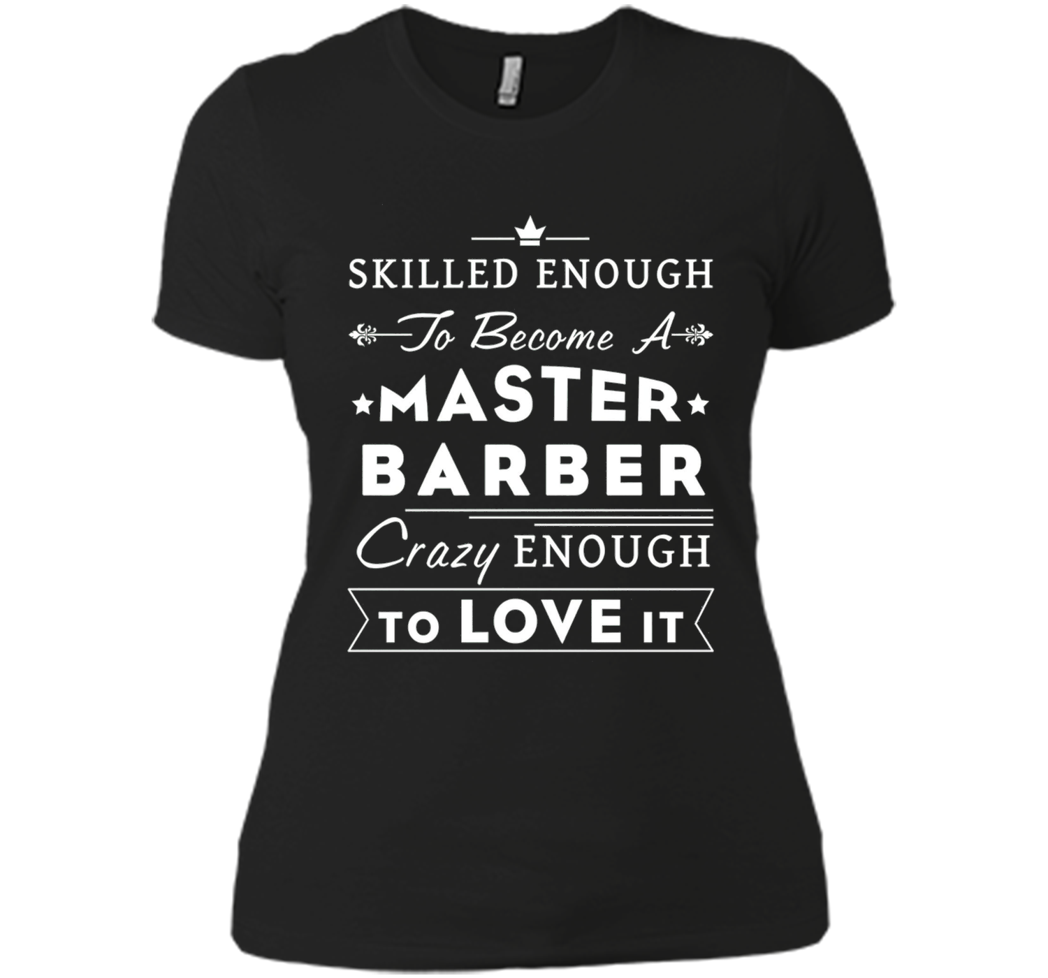 • Text on the shirt reads: Skilled enough to become a master barber. Crazy enough to love it